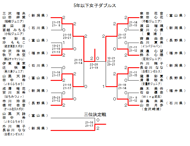 | G5D-15 | 柏崎Jr.[新潟県] | 三沢 理央・山田 絆愛 | 2 | 22-20 21-19 | 0 | 崇田 花音・崇田 心花 | 不動Jr.[富山県] | |