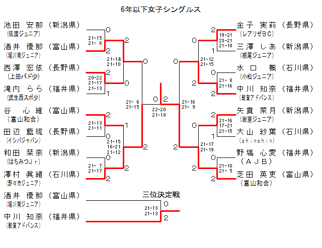 | G6S-16 | 敦賀アドバンス[福井県] | 中川 知奈 | 2 | 21-13 21-13 | 0 | 酒井 優那 | 堀川南Jr.[富山県] | |